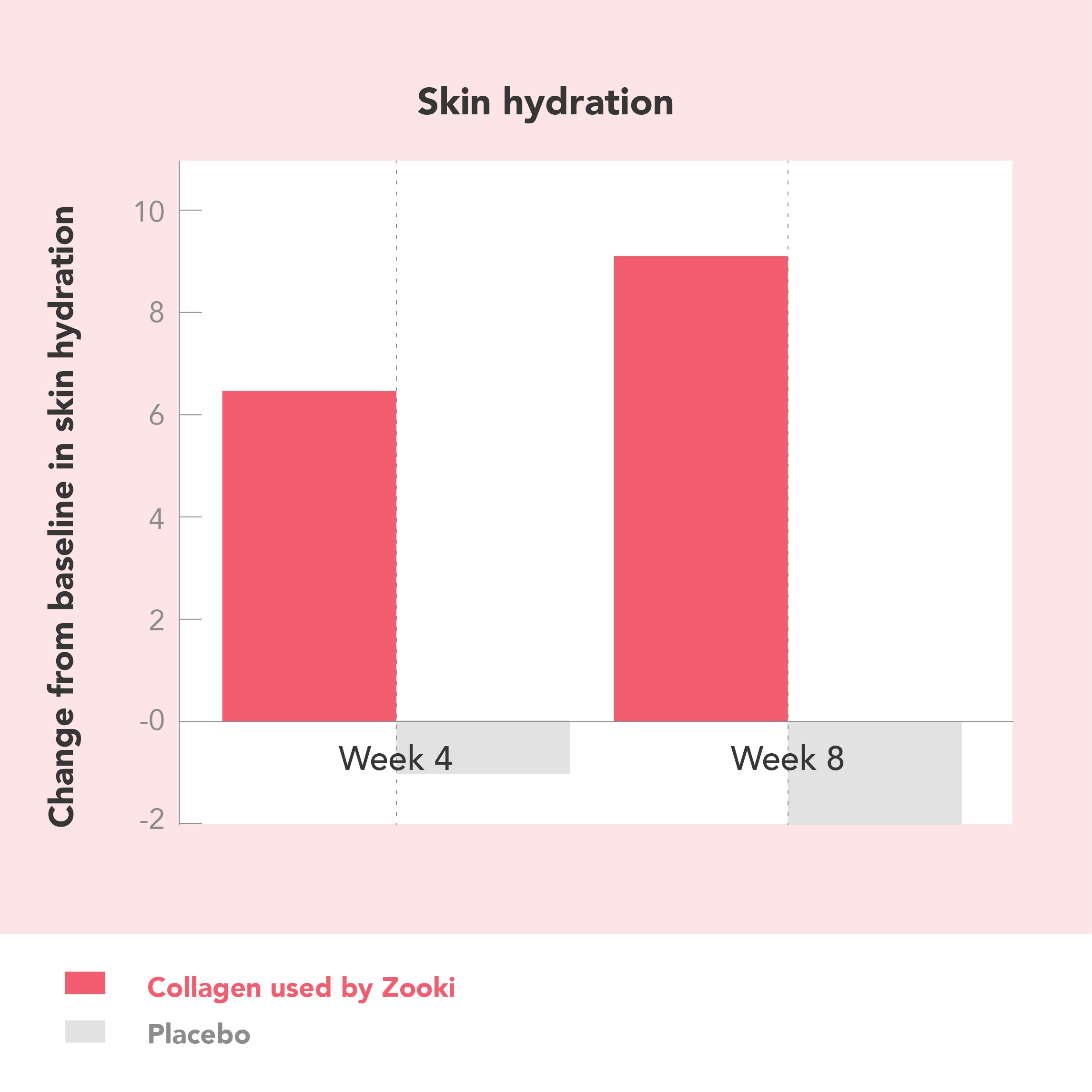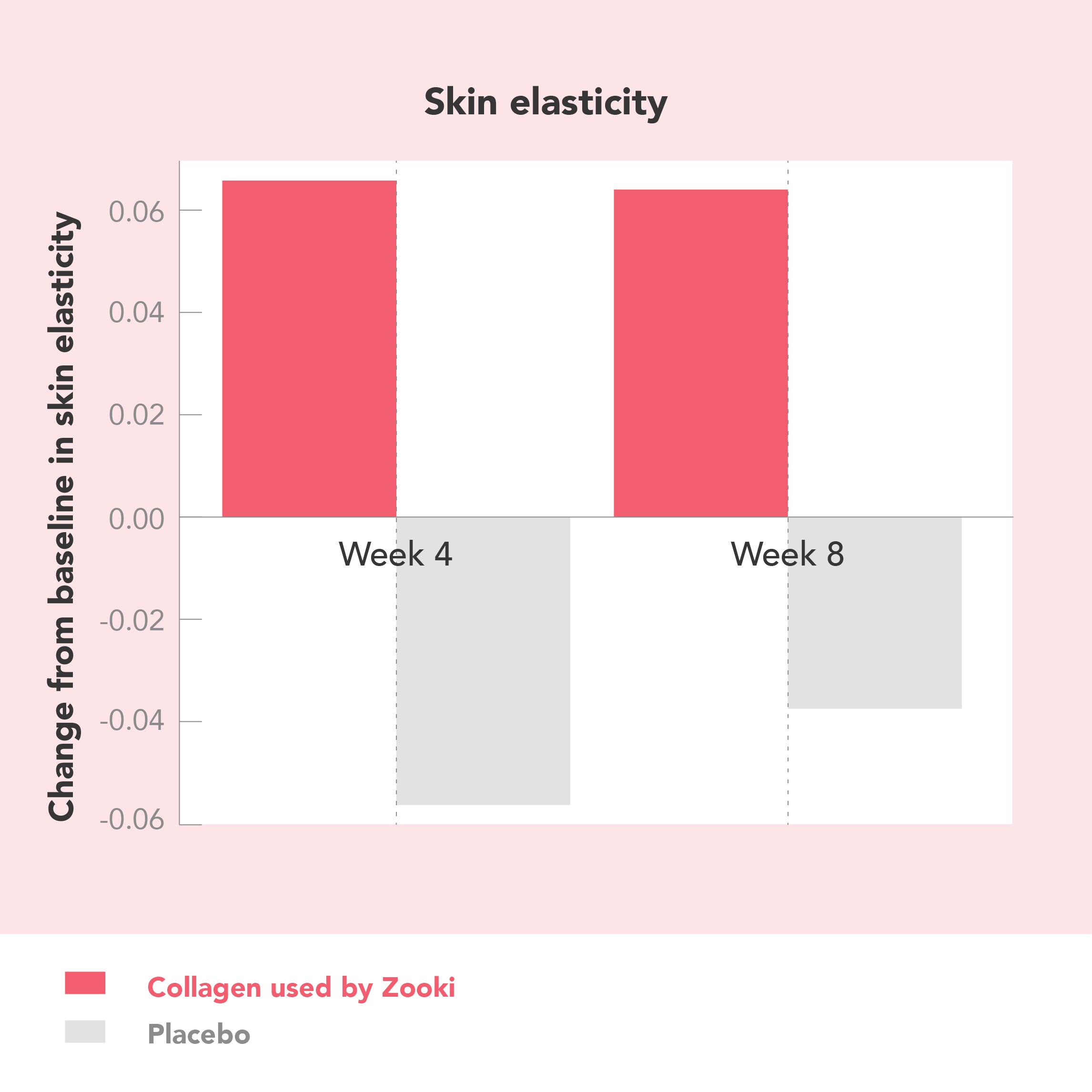 A clinical trial found significant improvements in skin elasticity, hydration and smoothness for those who took Zooki collagen compared to the placebo in as little as 4 weeks.