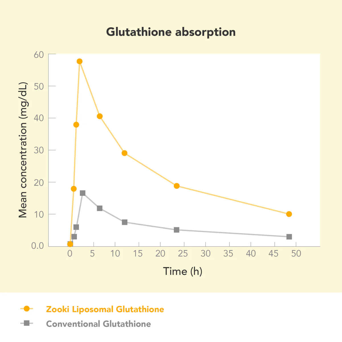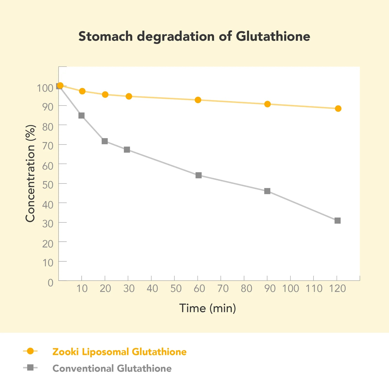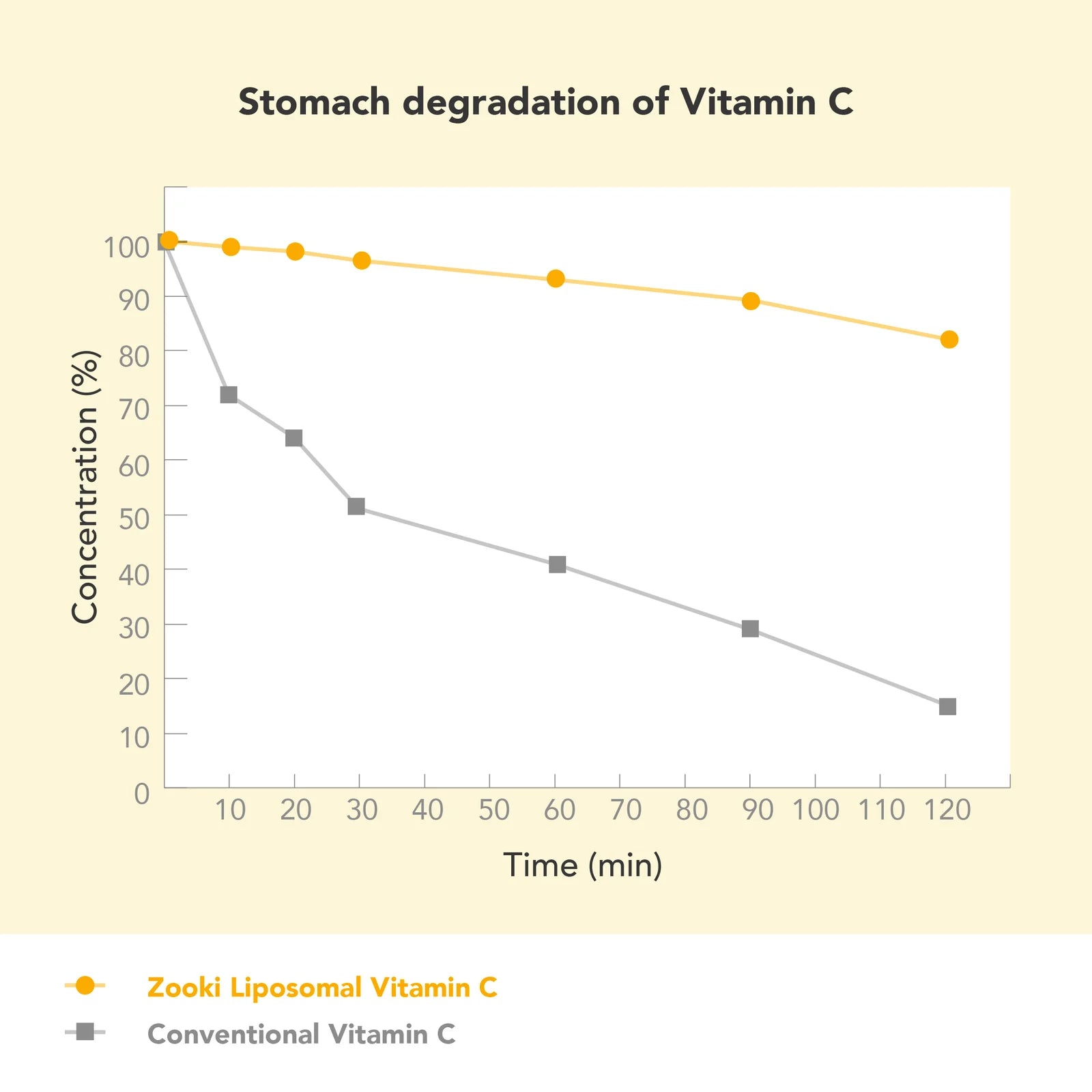To try and measure the amount of a supplement that gets destroyed in our digestive system, we teamed up with a university to conduct in vitro studies that simulated the acidic conditions of both the stomach and the intestines, and measured how nutrients such as Vitamin C and Glutathione held up over time. We then ran the same exact studies but with the nutrients shielded inside Zooki Liposomes.