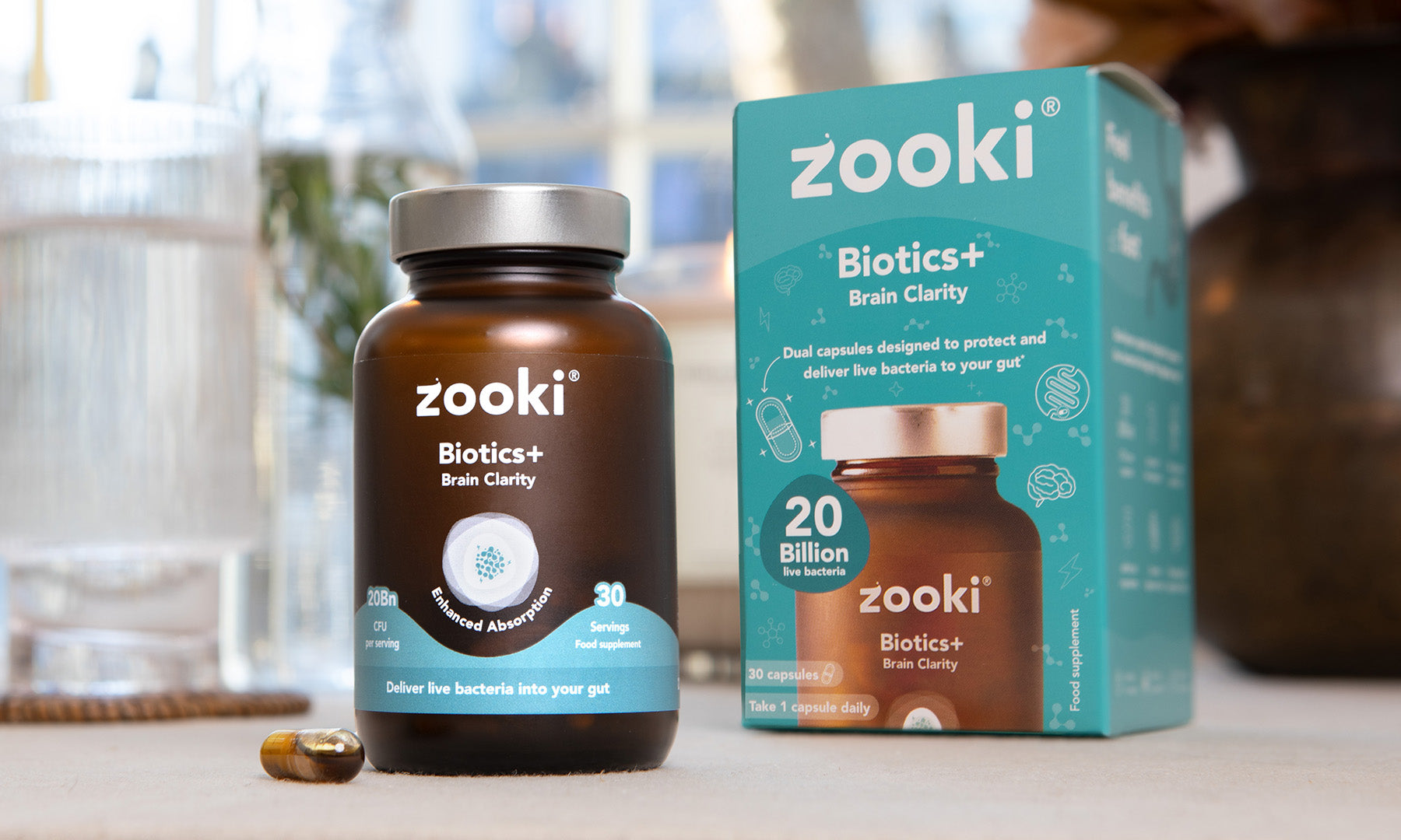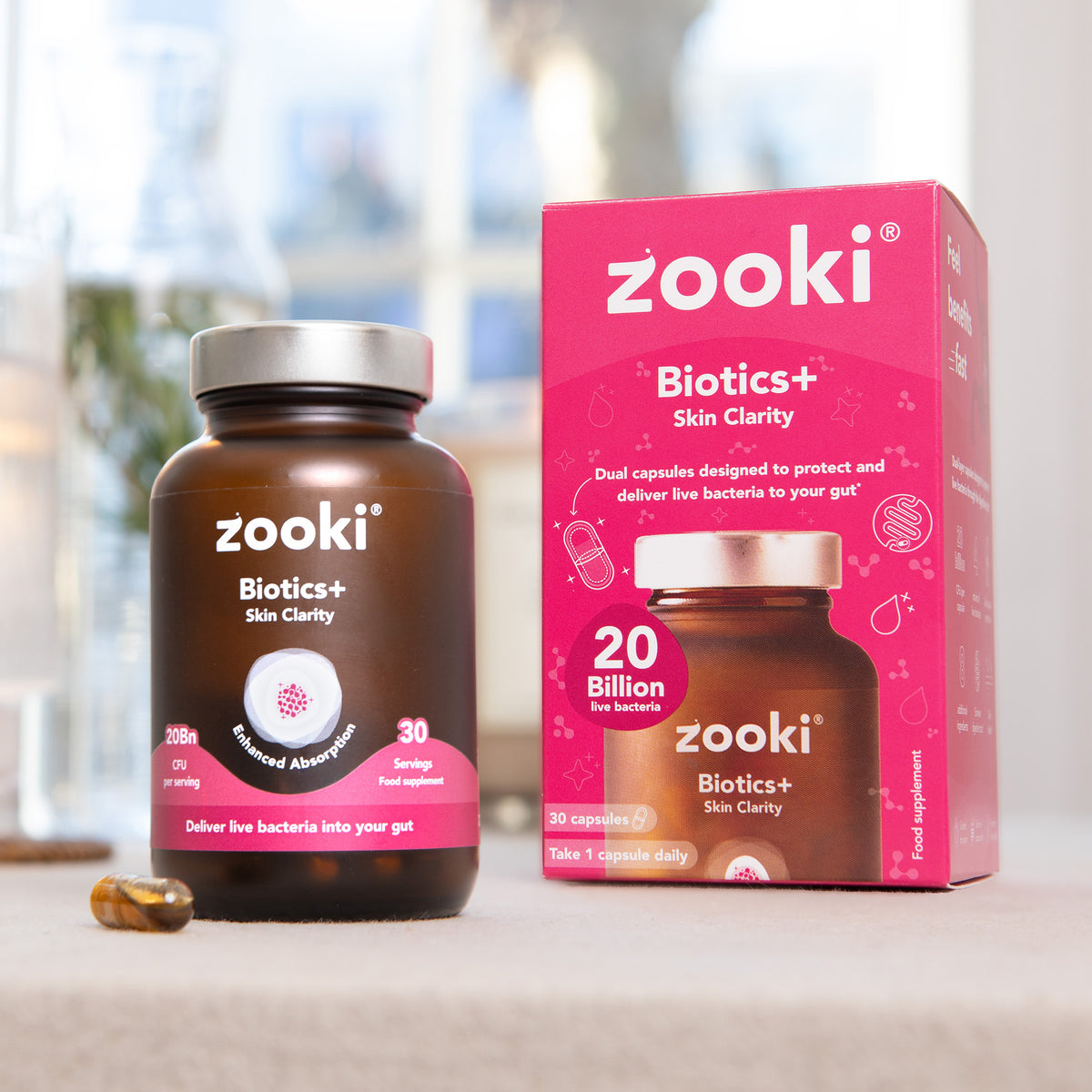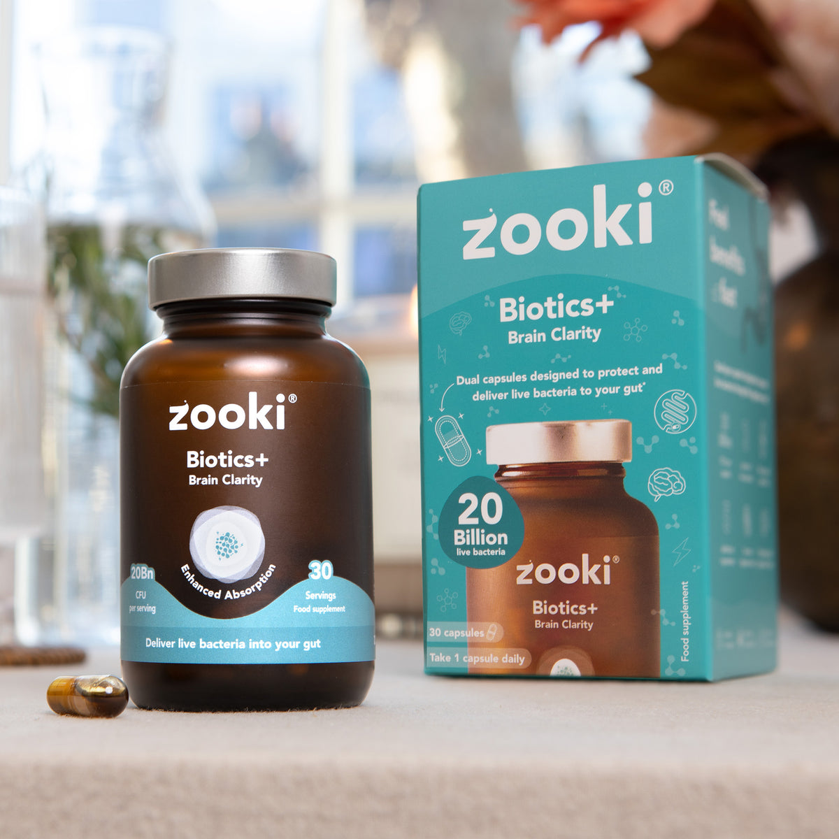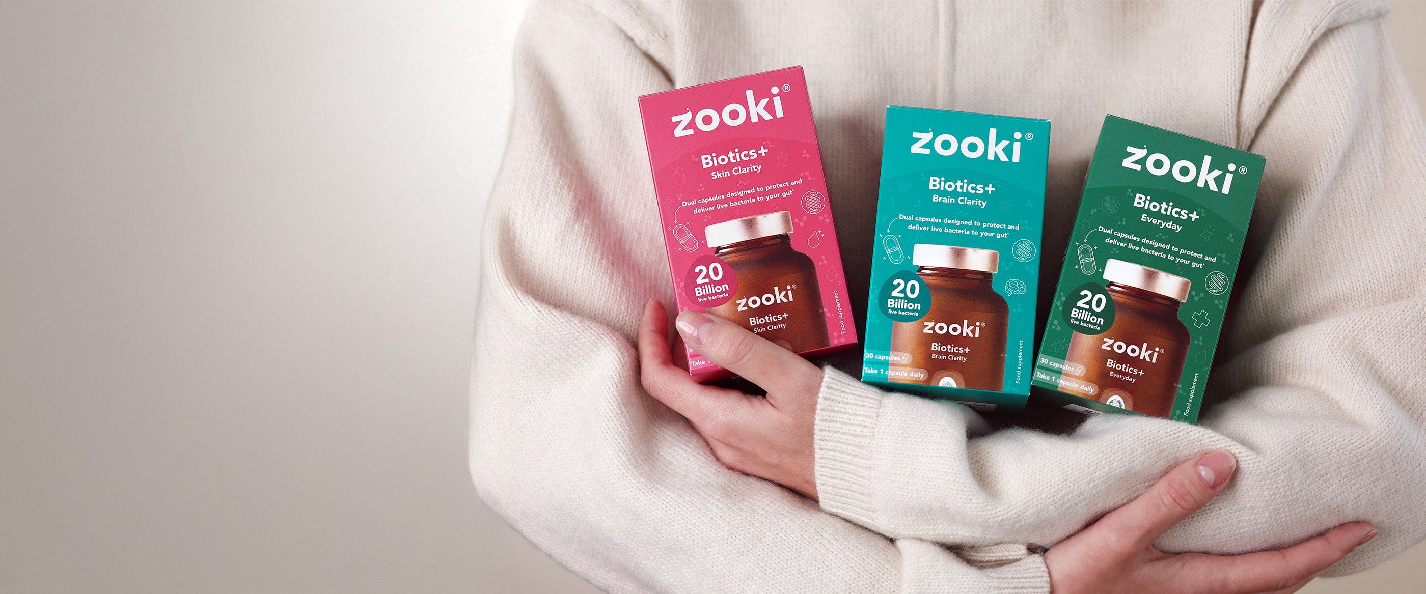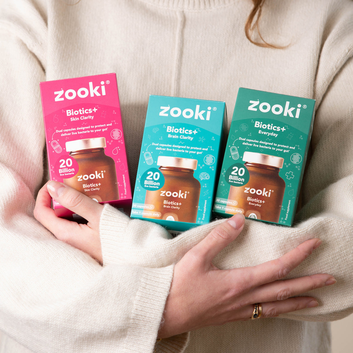 Biotics+ is Zooki’s advanced probiotic range, developed to support the gut and the wider systems it influences, including the brain, skin and everyday digestive health. The range includes three targeted formulas — Brain Clarity, Skin Clarity and Everyday — each designed around specific probiotic strains and supportive nutrients chosen for their role in key gut pathways.